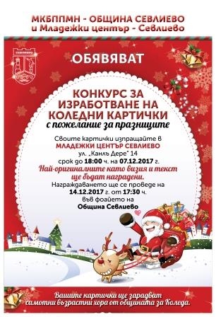 - ЦЕЛ: Конкурсът е насочен към всички деца и младежи на територията на общината. Има за цел да провокира желание у подрастващите да изработят коледна картичка, която да бъде изпратена на самотен човек от община Севлиево. Участниците в конкурса ще бъдат ангажирани в дейност, която ги насочва към положителен модел на поведение и разбиране на другия. Дейността цели и превенция на асоциалното поведение на малолетните и непълнолетните.