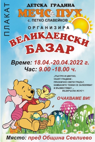 Също така детска градина „Мечо Пух” организира Великденски базар с артикули изработени от педагогически и помощен персонал! „Купете и с пожелание за здраве отнесете! Каним всички на базара за да споделим най-светлият български празник!“, споделят от ръководството на детската градина. Великденският базар ще се проведе от 18 до 20 април пред сградата на Община Севлиево.