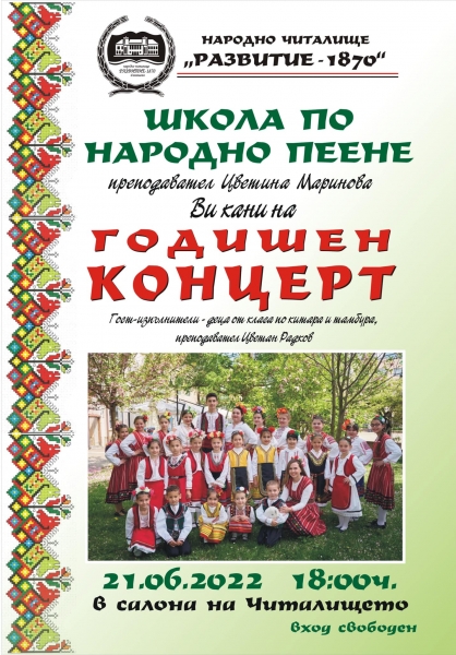 В края на творческия сезон на концерт канят от Школата по народно пеене при Народно читалище „Развитие-1870”.