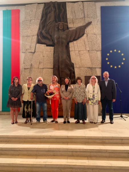 отляво: Радостина Койчева - трето място, Дафинка Станева - първо място, Димитър Васин - жури, Даниела Йорданова - жури, Светлана Николова - второ място, акад. Благовеста Касабова - гост, Ваня Георгиева - отличена севлиевска поетеса и д-р Иван Иванов - кмет на Община Севлиево.